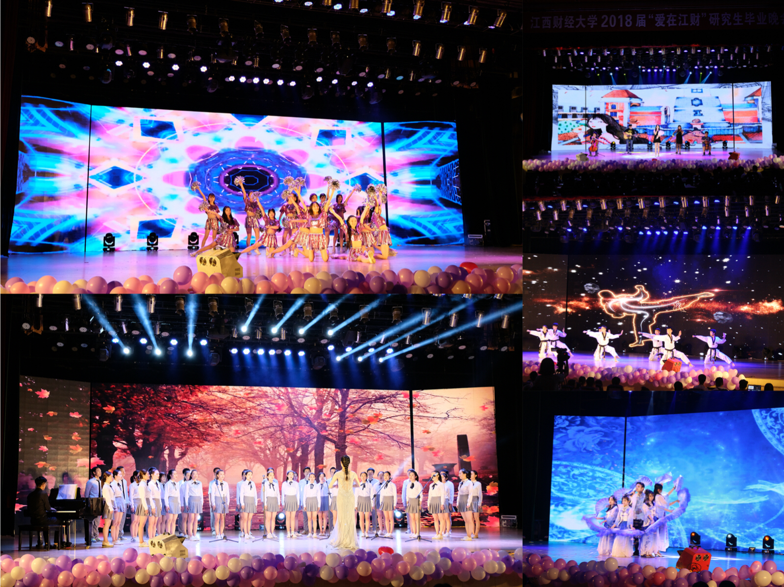 朝气蓬勃的《Bang Bang》开场舞,毕业晚会拉开帷幕;武术《龙凤飞舞》展现了江财学子刚劲有力、气吞山河的气势;《稻香remix》的歌曲,洋溢着青春的气息;“鸽”舞青春,精彩的魔术表演让观众眼前一亮,仿佛走进了魔幻的世界;留学生lorage主唱的《I’m yours》让我们看到蒙古人的柔情;婉转低沉的古筝,如靡靡之音,回响天际,泉水般的钢琴之音如行云流水道出了柔美的《女儿情》;《抖音神曲串烧》传达出年轻人张扬的个性;幕布剧《拾光密语》通过富有创意的方式,演绎了研究生平凡而又生动的故事,将观众们带到曾经独属于自己的江财时光;跳动的音符,激昂的旋律,“是你给我破茧的力量,写下梦想的诗篇”,这是江财人共同谱写的《光辉岁月》。