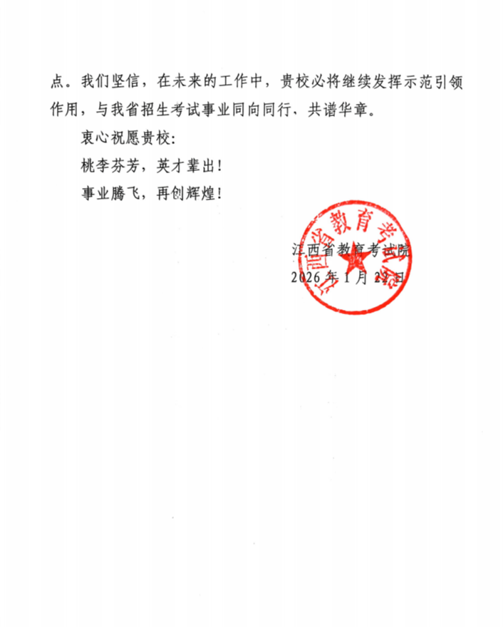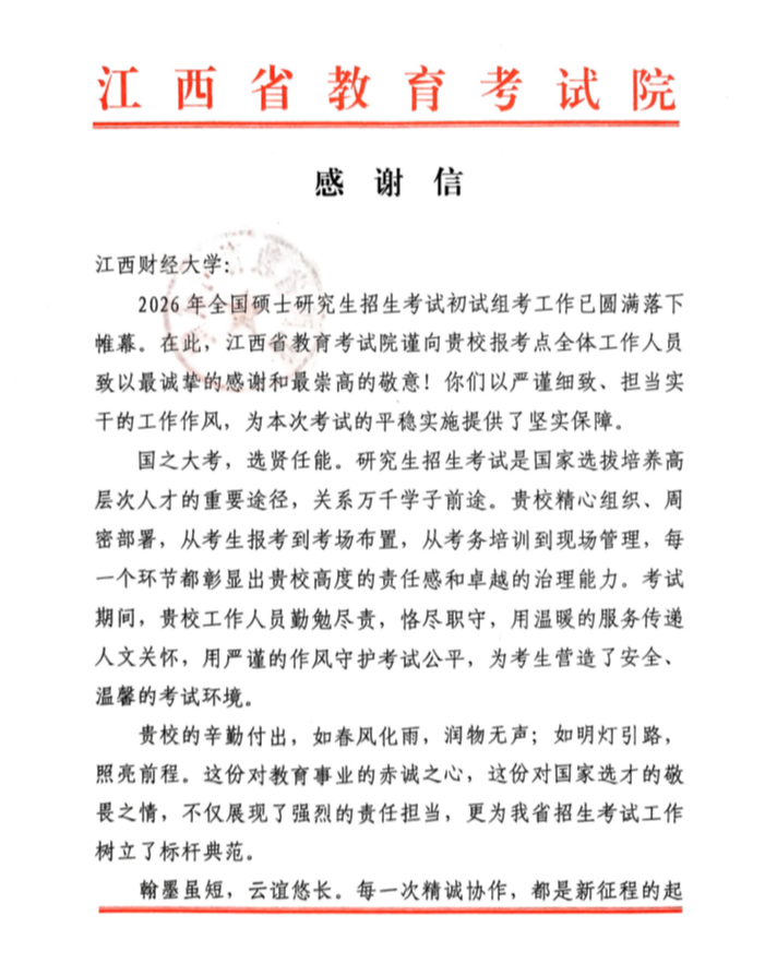 近日,江西省教育考试院向江西财经大学发来感谢信,对我校报考点在2026年全国硕士研究生招生考试初试组考工作中的倾情付出予以高度肯定,对全体研考工作人员致以诚挚谢意,这份认可既是荣誉,更是对我校研考工作的莫大激励。